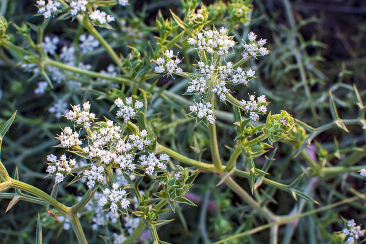 Echinophora spinosa is a striking plant native to Croatia, found in coastal areas and dry, rocky habitats.